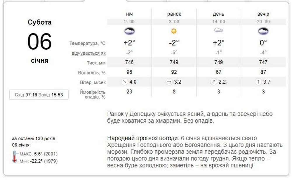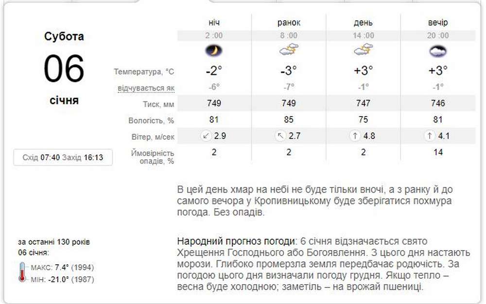 Приблизно така ж погода і у Дніпрі. Від 4 з позначкою “мінус” до 2 з позначкою “плюс”. Без опадів. Вранці можливо визирне сонце, а потім буде похмуро.