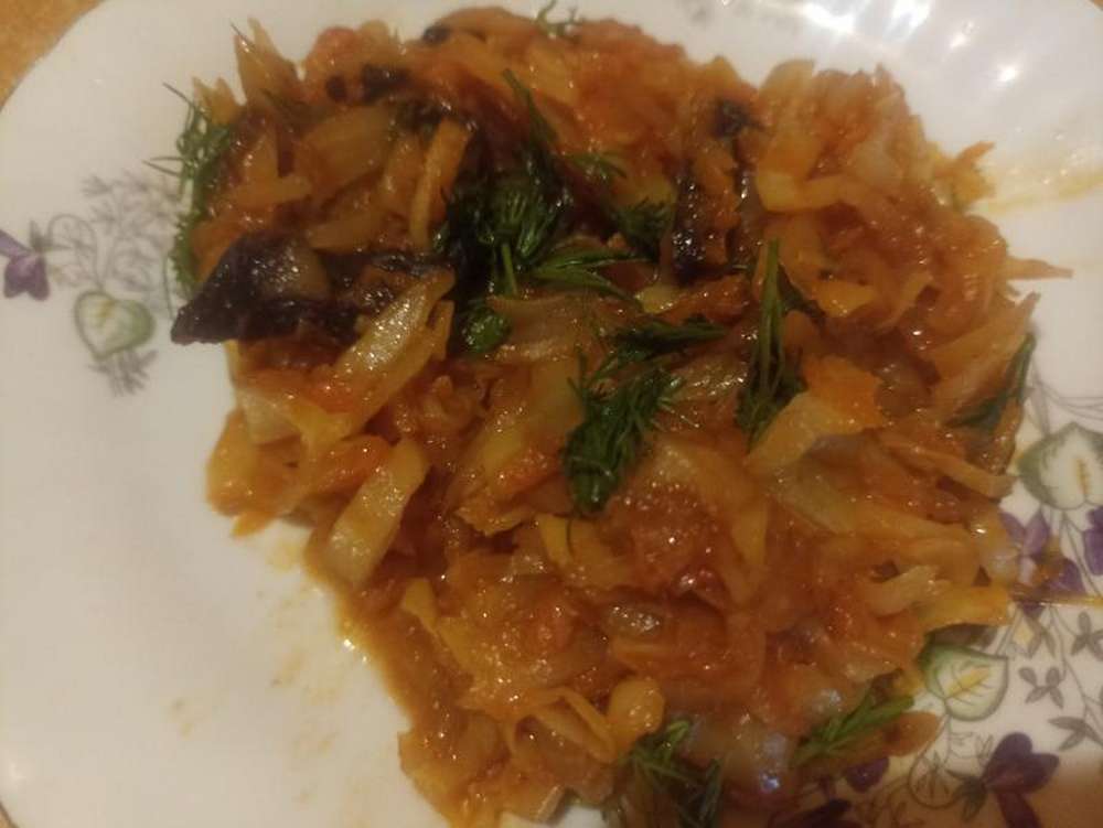 - Додати до капусти томатну пасту, цукор і чорнослив. Знову добре все перемішати. Тушкувати ще хвилин 15-20 – до готовності.