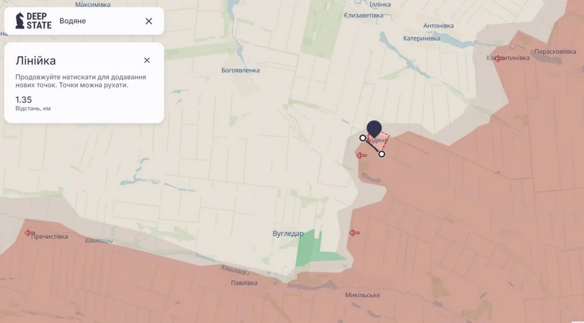 ЗСУ довелось відступити з Водяного, розташованого за 4 км від Вугледара, свідчить карта проєкту DeepState.