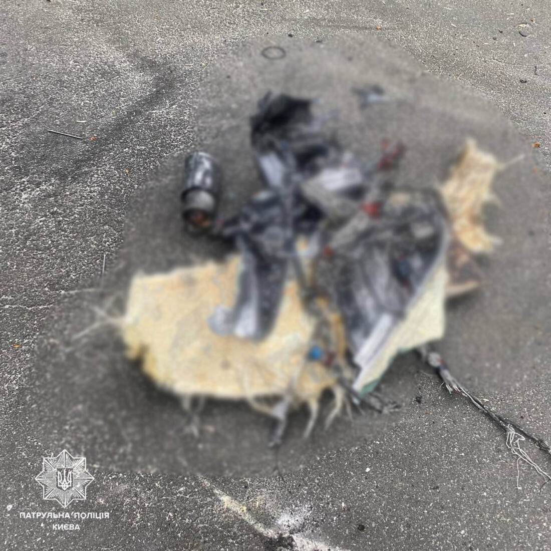 Чергова повітряна атака на Київ була здійснена російськими загарбниками в ніч на 4 травня. Сили ППО збили всі повітряні цілі над столицею. У поліції показали фото уламків.