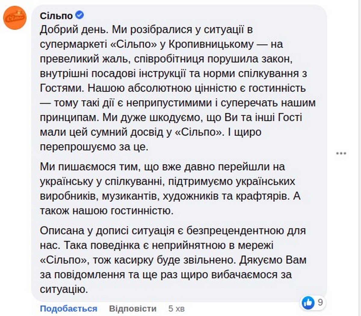 Згодом Надія додала, що вона поскаржилася в офіс мовного омбудсмена і залишила скаргу на гарячій лінії «Сільпо». Від адміністрації компанії навіть отримала відповідь – касирку пообіцяли звільнити.