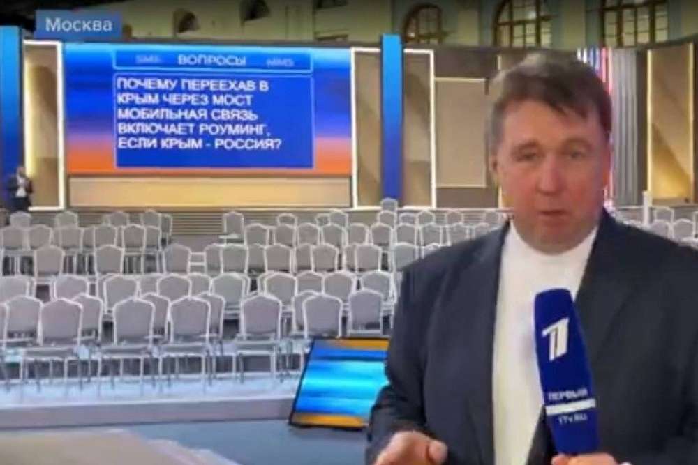 Як передає НСН, фото із залу, де проводять пресконференцію, публікують російські ЗМІ та Telegram-канали.