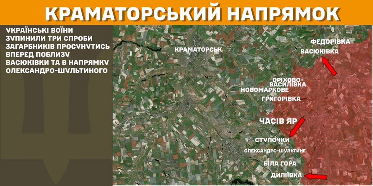 - Три спроби загарбників просунутись вперед поблизу Васюківки та в напрямку Олександро-Шультиного зупинили українські воїни на Краматорському напрямку.