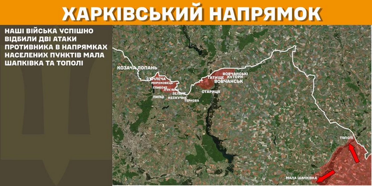 - На Харківському напрямку минулої доби наші війська успішно відбили дві атаки противника в напрямках населених пунктів Мала Шапківка та Тополі.