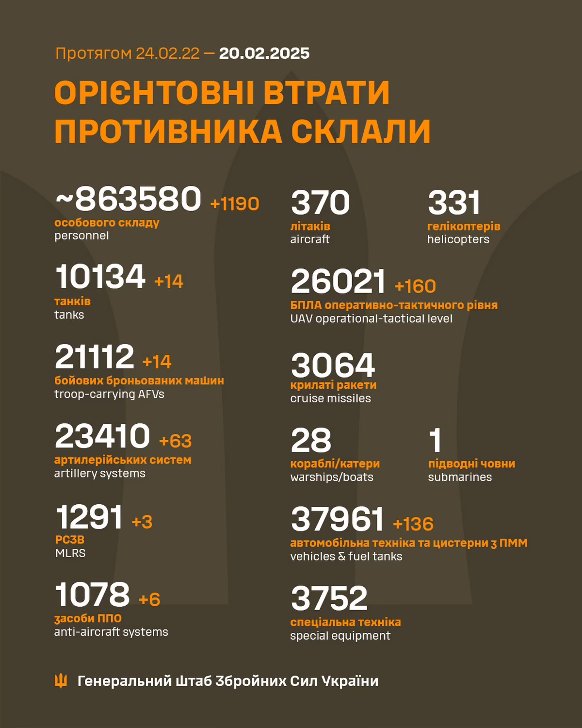 Загальні бойові втрати противника з 24.02.22 по 20.02.25 орієнтовно склали / The estimated total combat losses of the enemy from 24.02.22 to 20.02.25