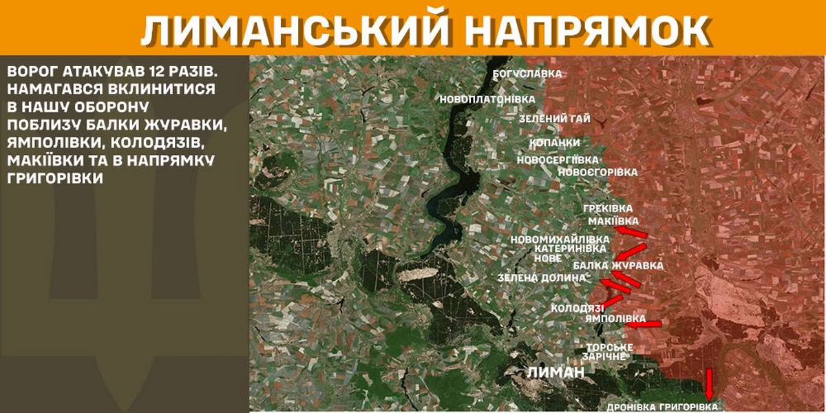 - На Лиманському напрямку ворог атакував 12 разів. Намагався вклинитися в нашу оборону поблизу Балки Журавки, Ямполівки, Колодязів, Макіївки та в напрямку Григорівки.