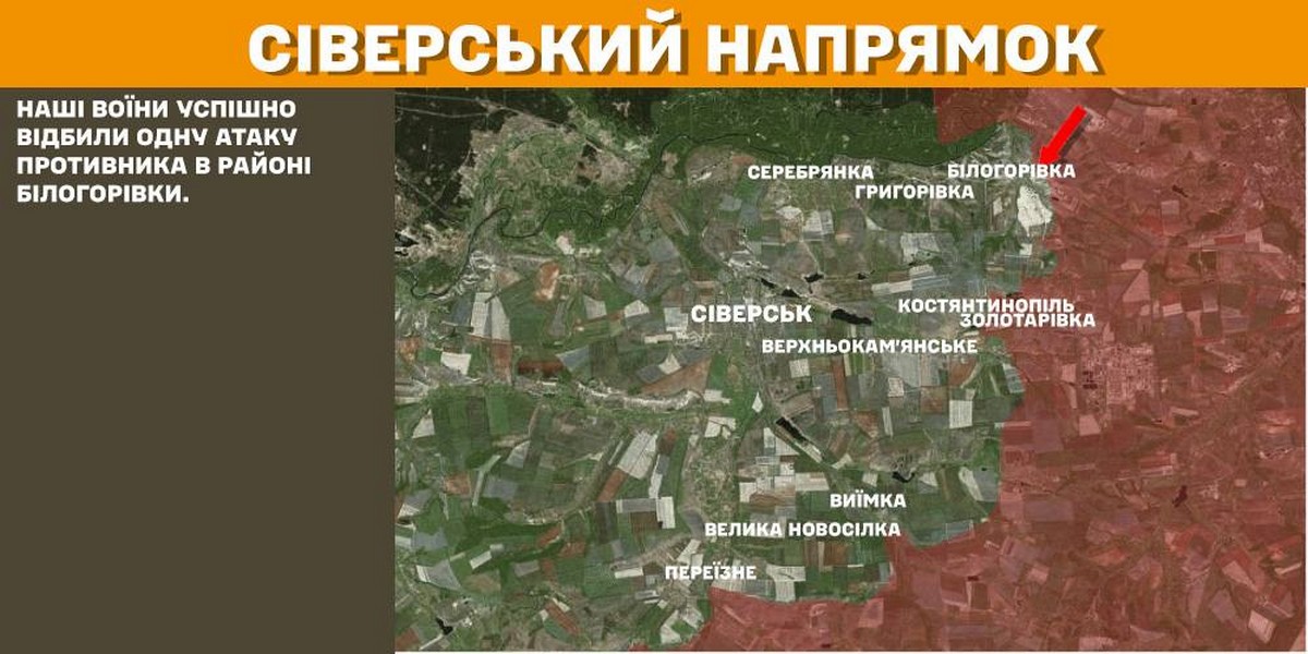 - На Сіверському напрямку наші воїни успішно відбили одну атаку противника в районі Білогорівки.