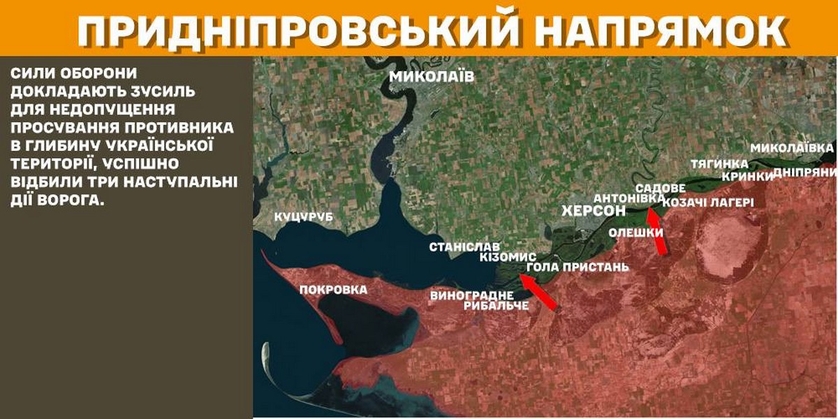 - Сили оборони докладають зусиль для недопущення просування противника в глибину української території, успішно відбили три наступальні дії ворога на Придніпровському напрямку.