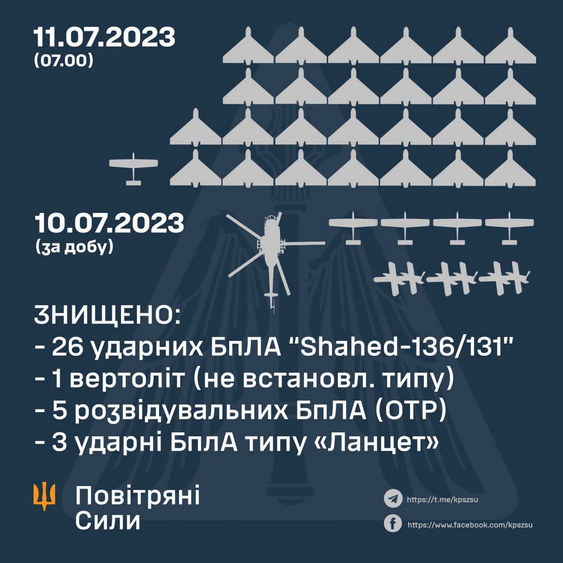 Крім того, за минулу добу, 10 липня, Повітряні Сили знищили ворожий вертоліт (тип уточнюється), три ударних БпЛА типу «Ланцет» та чотири розвідувальних дрони оперативно-тактичного рівня.