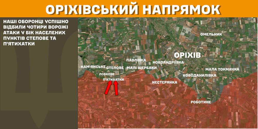 На Оріхівському напрямку наші оборонці успішно відбили чотири ворожі атаки у бік населених пунктів Степове та П’ятихатки.