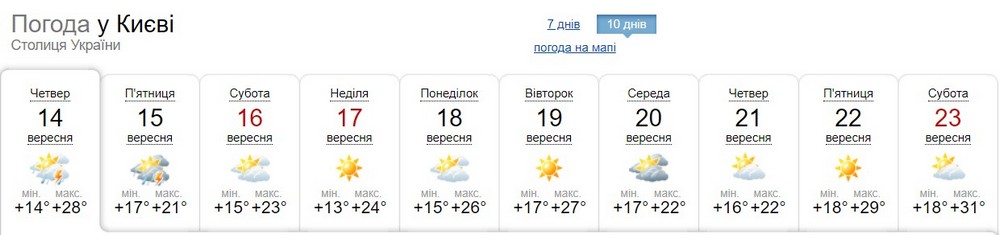 Sinoptik.ua пише, що 14 та 15 вересня в Києві пройдуть дощі з грозами. Температура повітря знизиться до 21-23 градусів тепла, проте з наступного тижня знову сягне позначки 27 на термометрі.
