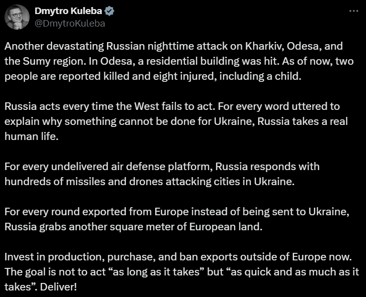 “Росія діє щоразу, коли Захід бездіяльний. За кожне слово, сказане, щоб пояснити, чому щось не можна зробити для України, Росія забирає реальне людське життя”, — наголосив Кулеба.