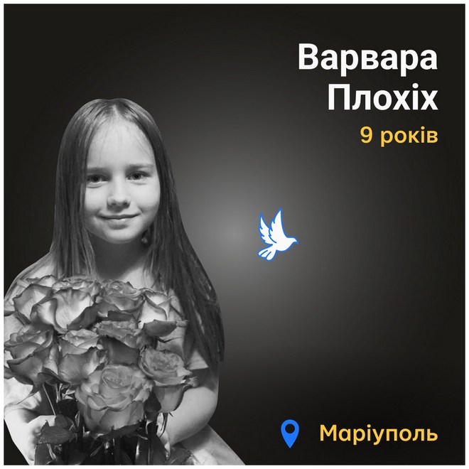Варварі Плохіх було 9 років. Вона загинула в Маріуполі 14 березня 2022 поряд із мамою Тетяною та бабусею Жанною.