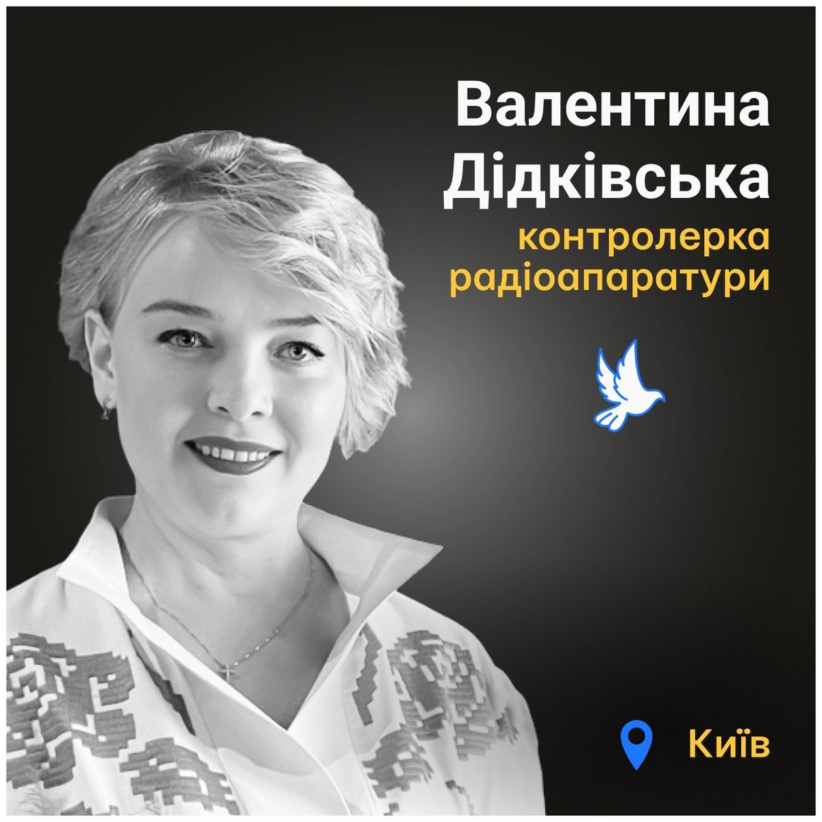 Валентина Дідківська загинула внаслідок російської атаки на Київ 29 грудня 2023 року. Поряд обірвалося життя ще понад 30 її колег. 9 січня 2024-го чоловік Валентини впізнав її тіло – він був на місці обстрілу, коли ще продовжували розбирати завали. Потім збіг підтвердили за допомогою ДНК-тесту.