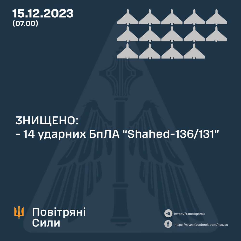 Усі 14 ворожих безпілотників було збито мобільними вогневими групами Повітряних Сил та Сил оборони України в межах Миколаївської, Херсонської, Хмельницької та Полтавської областей.