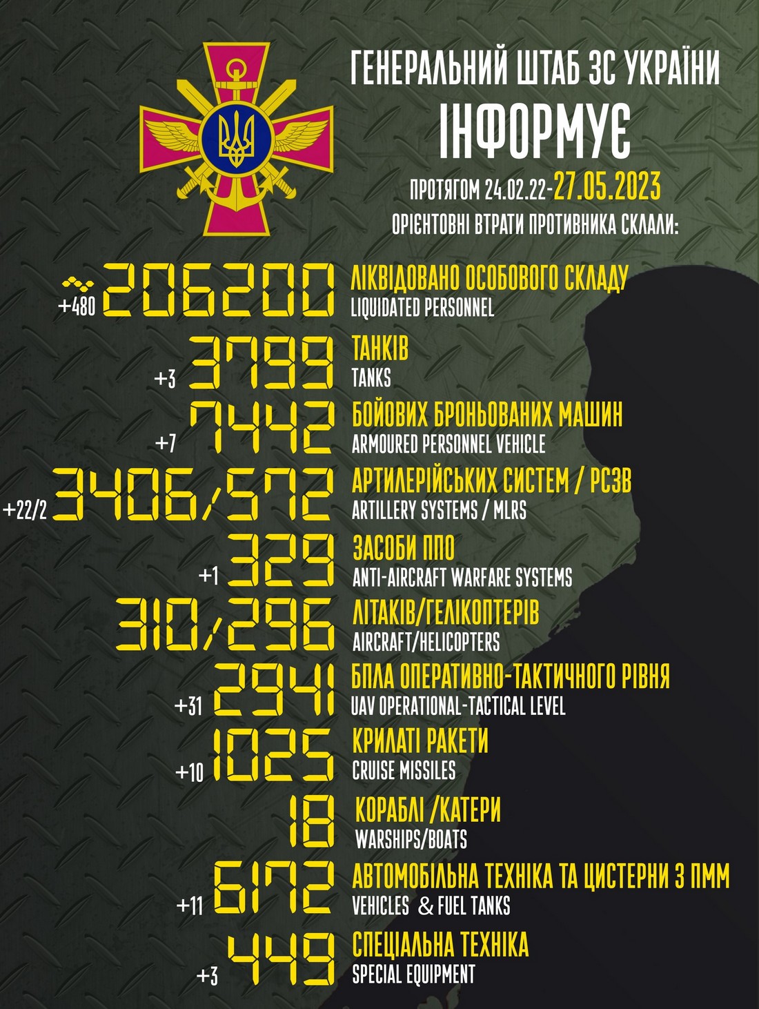 Загальні бойові втрати противника з 24.02.22 по 27.05.23 орієнтовно склали: