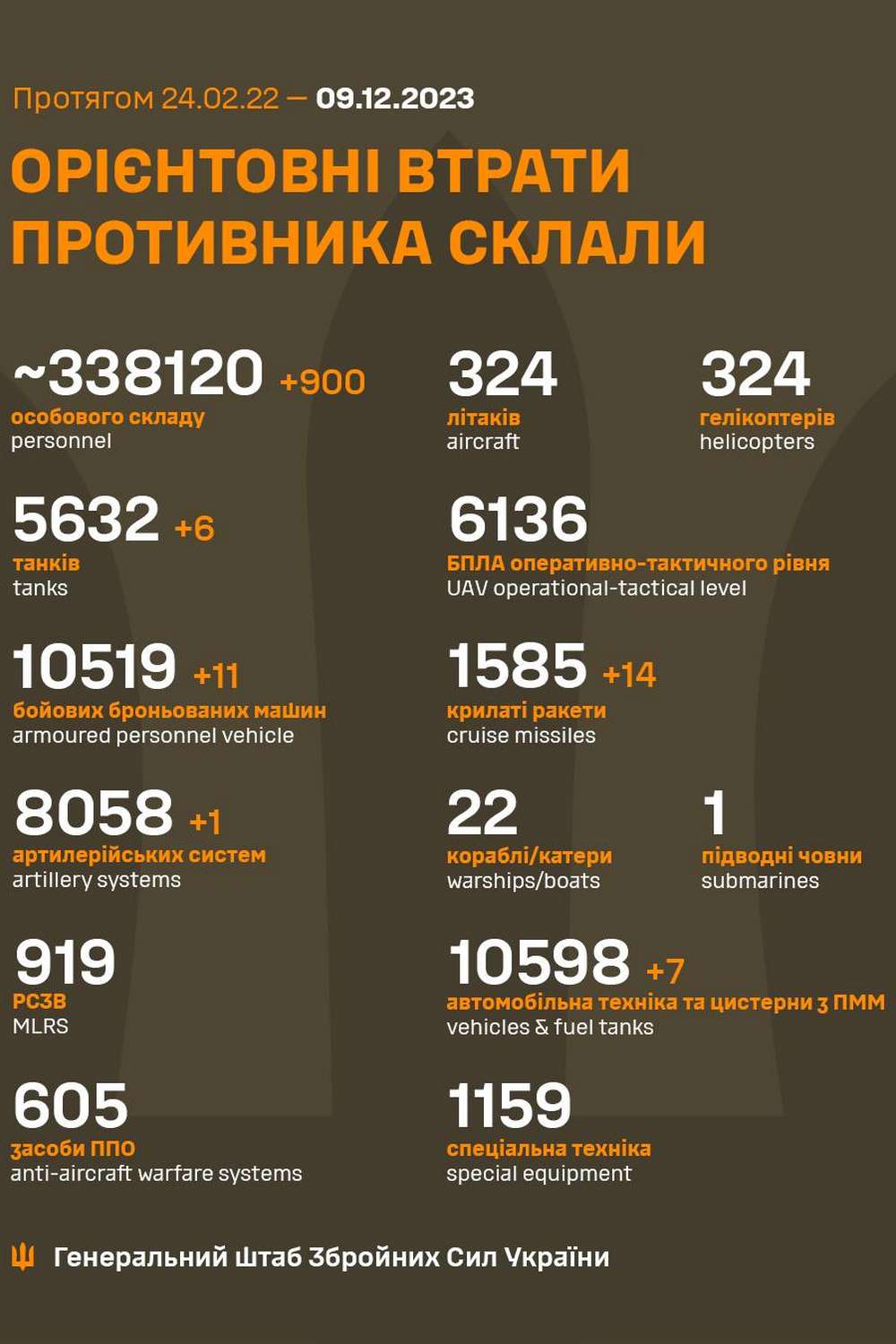 Загальні бойові втрати противника з 24.02.22 по 09.12.23 орієнтовно склали: