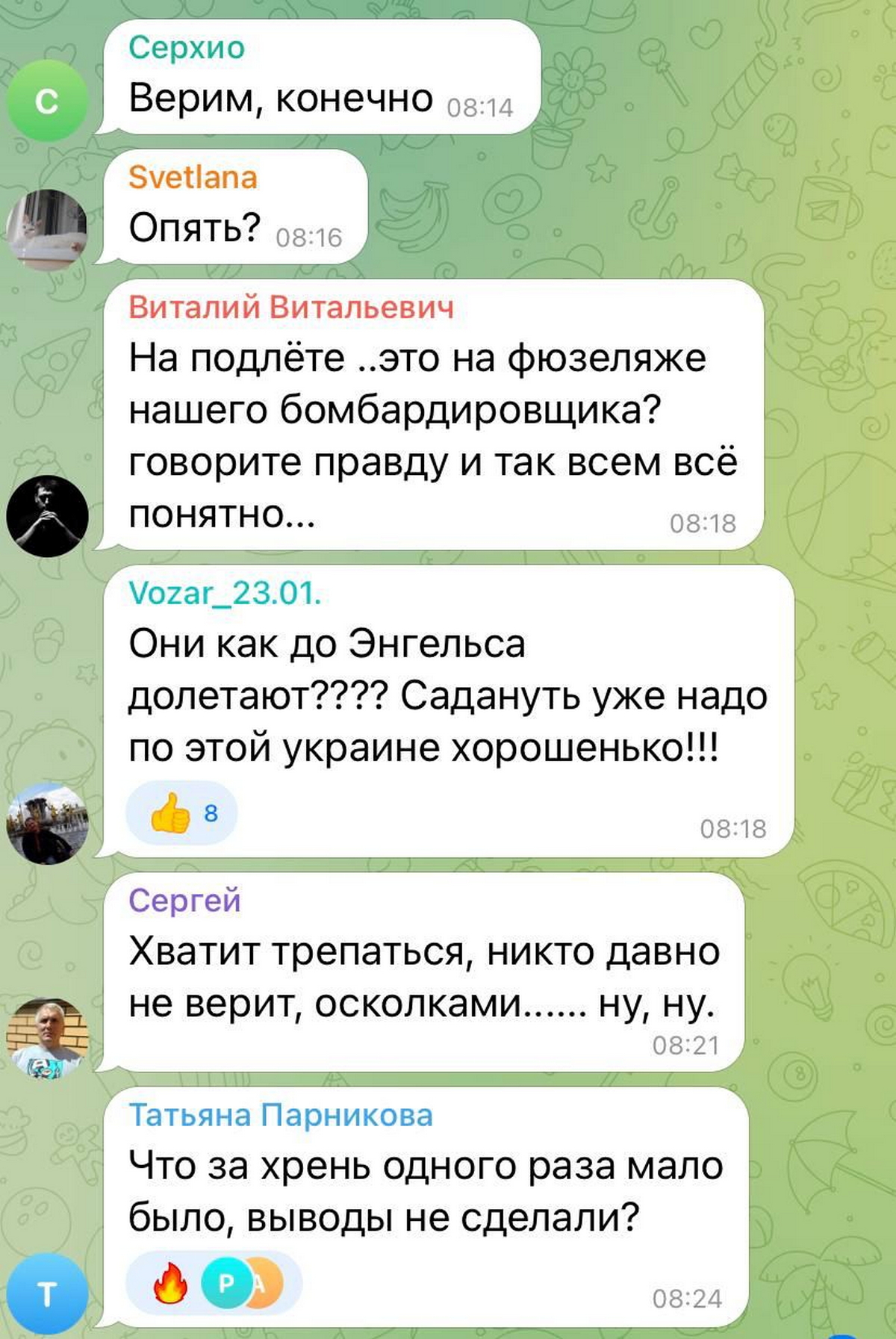 А в коментарях у російських телеграм-каналах просто «палає». Росіяни все ніяк не можуть зрозуміти, як це друга армія світу допускає, що українські безпілотники літають над територією «супердержави» сотні кілометрів як у себе вдома.