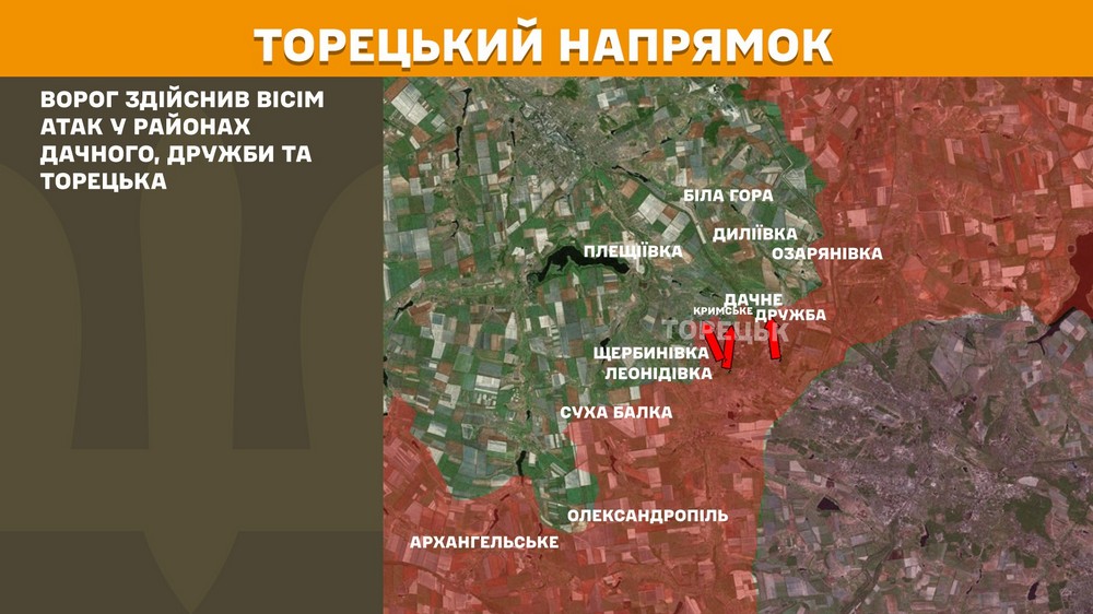 - На Торецькому напрямку ворог здійснив вісім атак у районах Дачного, Дружби та Торецька.