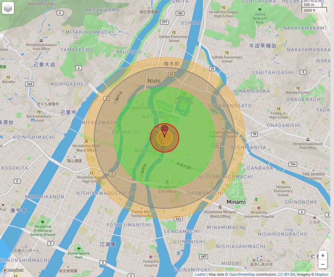 - Темно-сірий колір — помірний радіус ураження вибухом, під час вибуху 100-кілотонної бомби радіус становить 3,26 км (площа — 33,5 км²). У цій зоні буде зруйновано більшість житлових будівель, смертельні випадки настають через дію вибухової хвилі. Висока ймовірність виникнення пожежі в приміщеннях, а пошкоджені в такий спосіб будівлі, швидше за все, згорять. Цей радіус часто використовується як орієнтир для середньої шкоди в містах.
