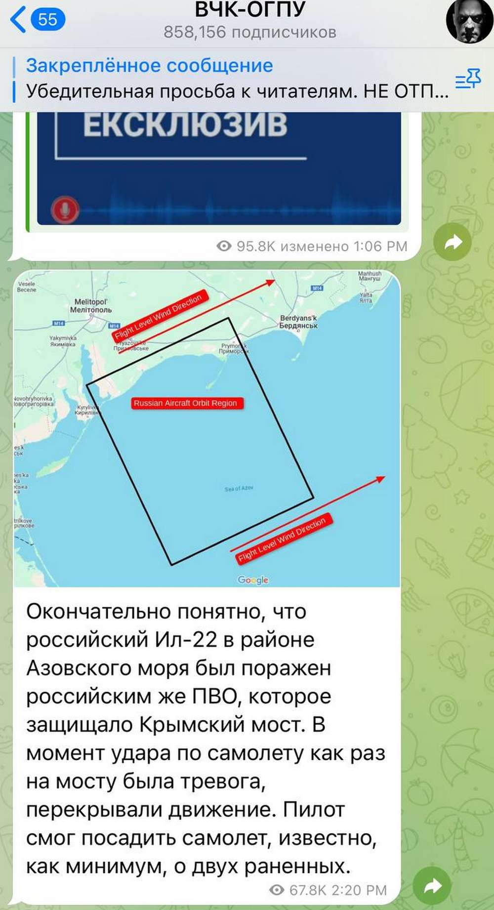 «Остаточно зрозуміло, що російський Іл-22 в районі Азовського моря був вражений російським ППО, яке захищало Кримський міст», — пише канал ВЧК ОГПУ