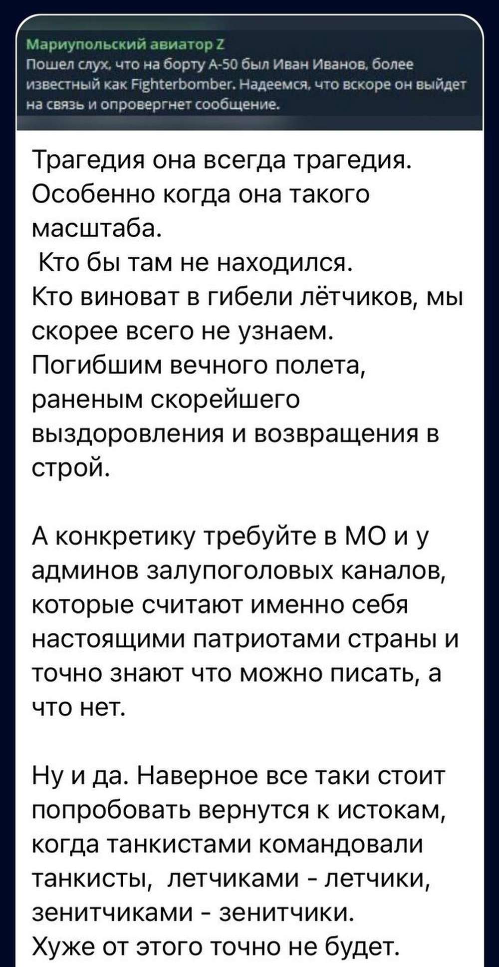«Щодо Іл-18/22 ситуація вже прояснилася, борт приземлився, але там є постраждалі (характер пошкоджень та їх причина до кінця неясні). Так що про збитий ІЛ наче фейк. За А-50 достовірною інформацією про МО РФ не надходило», – написав канал Colonelcassad