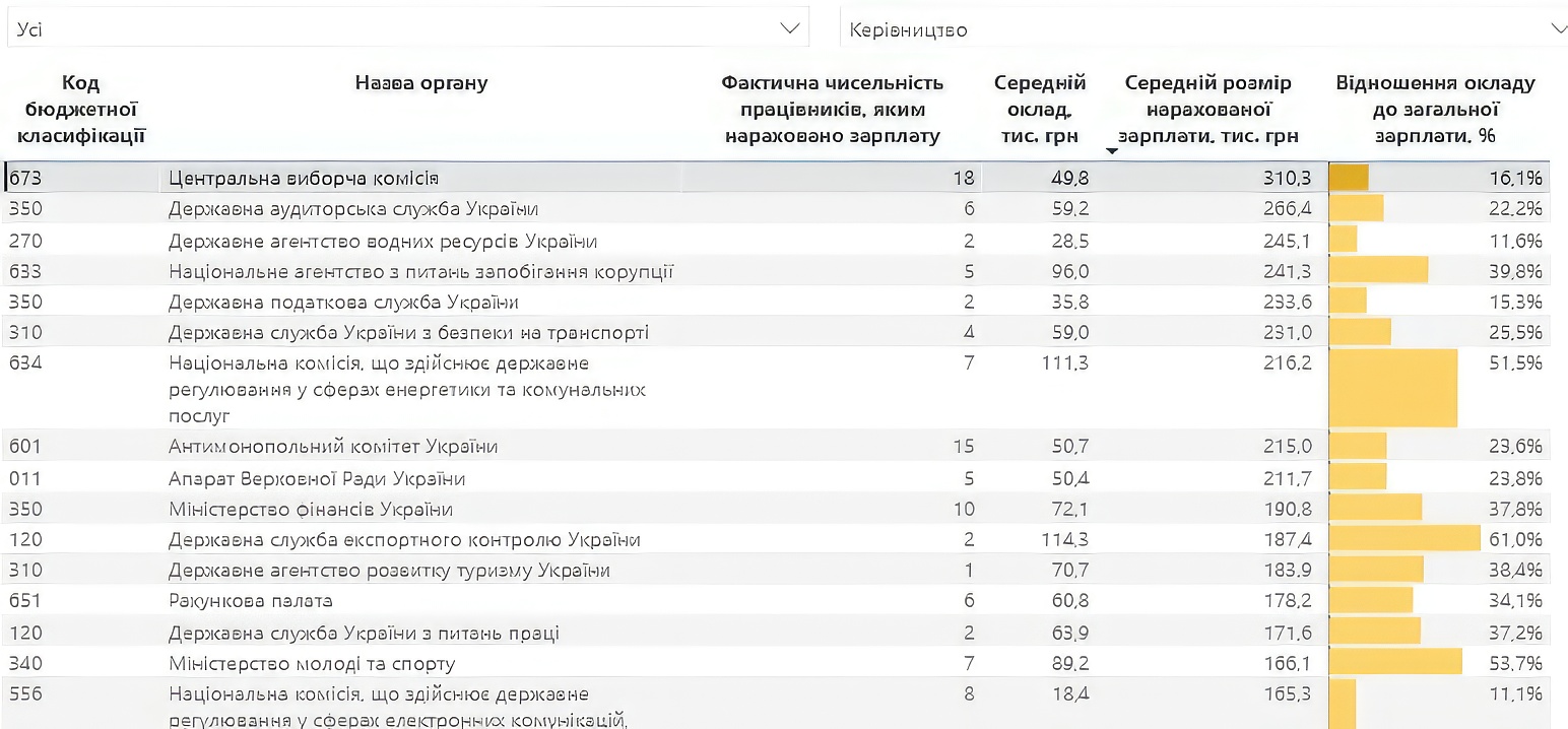 У Центральній виборчій комісії, яка фактично не має роботи під час війни через відсутність виборів, зарплата становить 97,2 тисячі гривень (248 осіб). Зарплата керівництва – найвища: 18 осіб отримують у середньому 310,3 тисячі гривень на місяць.